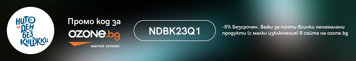 Ozone.bg избраха да подкрепят “Нито ден без книжки” и изплащат 5% от поръчките с кода (NDBK23Q1) за дейността на общността. Всяка поръчка с този код е огромна подкрепа и ви благодаря, че го използвате! ❤
